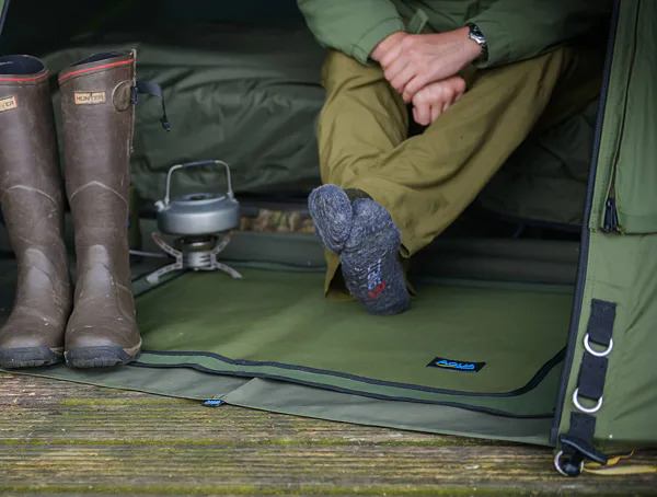 Spodní část rohožky tvoří pevný materiál Nyplex, který je extrémně odolný vůči oděru i poničení na tvrdém podkladu. Díky tomu ji můžete využít nejen uvnitř bivaku, ale i samostatně před vstupem nebo přímo na břehu. Neoprenová vrstva navíc poskytuje tepelnou izolaci, což oceníte především v chladných měsících.
