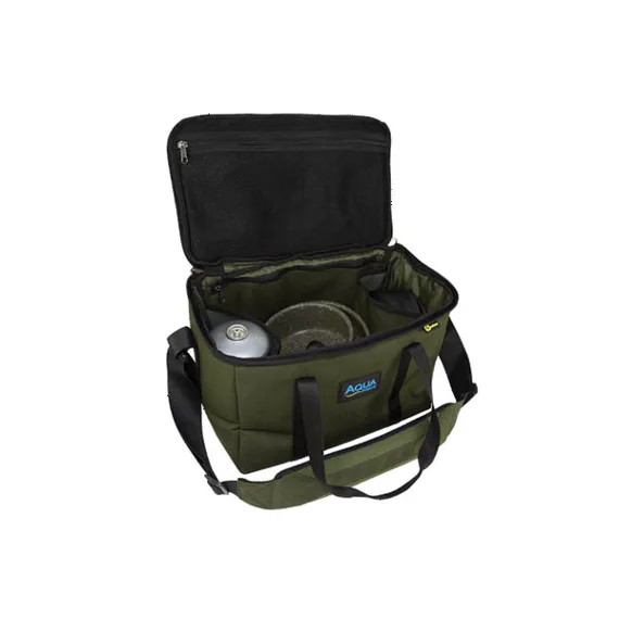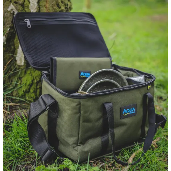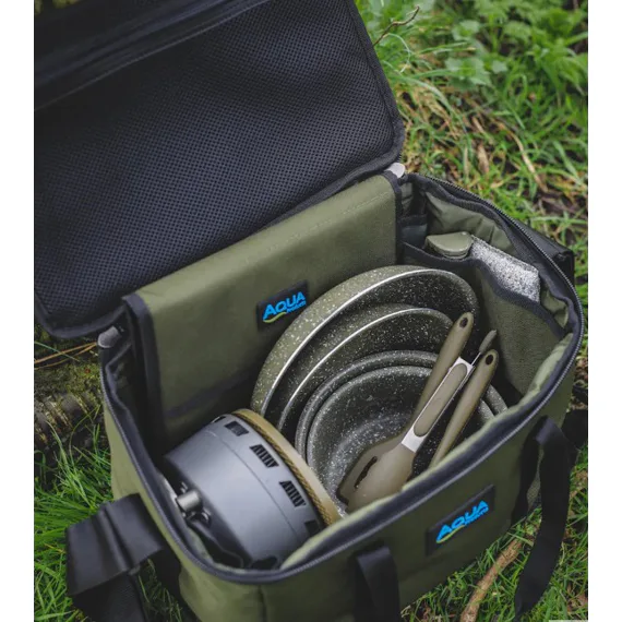 Aqua Cookware Bag Black Series je navržena pro přehledné a bezpečné uložení veškerého kempingového nádobí, které potřebujete při pobytu u vody. Díky prostornému vnitřku pojme vařič, pánev, talíře, příbory i sadu Brew Kit Bag nebo Compact Food Set. Pevná konstrukce z odolného materiálu Endura chrání obsah před nárazy i znečištěním a zároveň zajišťuje dlouhou životnost při pravidelném používání v náročných podmínkách rybolovu.