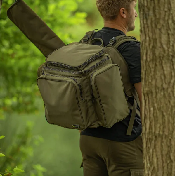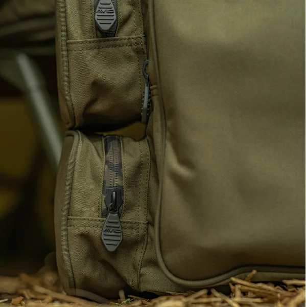 Batoh je vybaven pěti vnějšími kapsami, které poskytují široké možnosti uspořádání. Tři boční kapsy jsou ideální pro drobnější příslušenství, přední kapsa pojme často používané vybavení a horní kapsa skrývá praktickou síťovanou přihrádku na zip pro bezpečné uložení menších předmětů. Díky pevnému madlu lze batoh snadno přenášet na krátké vzdálenosti, což oceníte například při častých přesunech mezi lovnými místy.