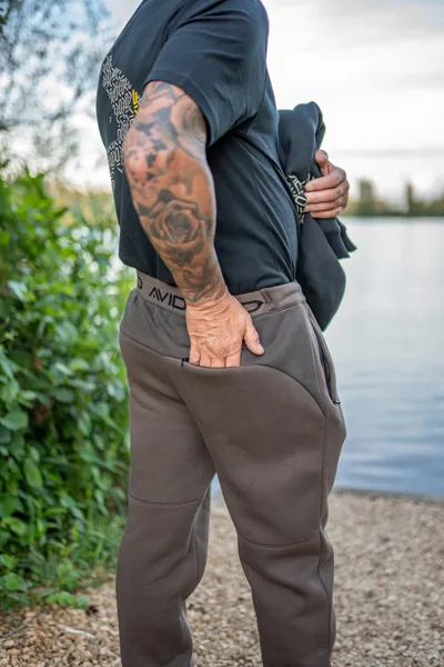 Tepláky jsou vybaveny pružným pasem s logem Avid Carp a stahovacími šňůrkami, které umožňují individuální utažení. Tři kapsy na zip – dvě boční a jedna zadní – poskytují bezpečné uložení drobností, jako je telefon, klíče nebo rybářské příslušenství, což oceníte zejména při pohybu kolem loviště.