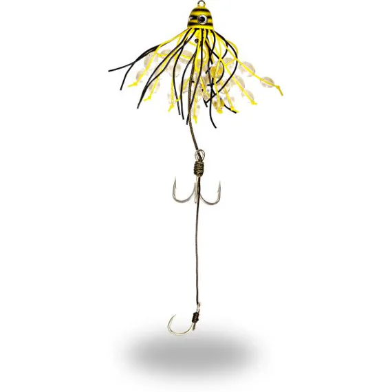 Černožlutá nástraha s gumovými chapadly a skleněnými korálky pro aktivní lov sumců.