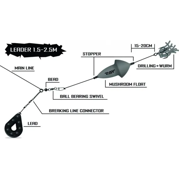 - pokud splávek Mushroom U-Float přimontujeme „nohou“ k návazci, narazí pak kompletní proud vody na spodní stranu hlavy houby a vytvoří tak silnější víření vody před nástrahou (vhodné na revíry se silnějším proudem)