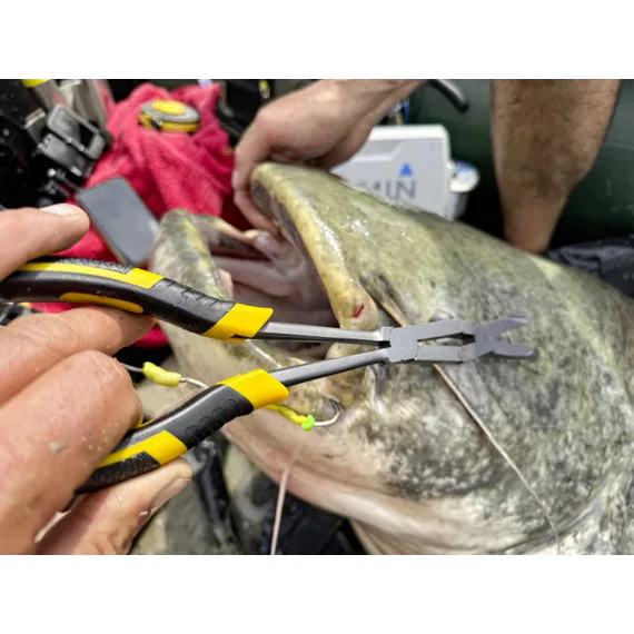 Silné kleště s dvojitým kloubem pro bezpečné uvolnění háčků ze sumčí tlamy.