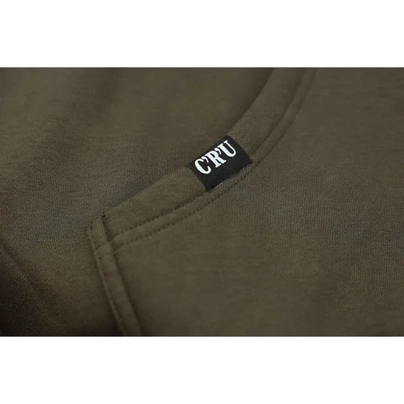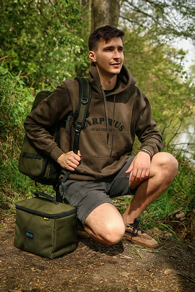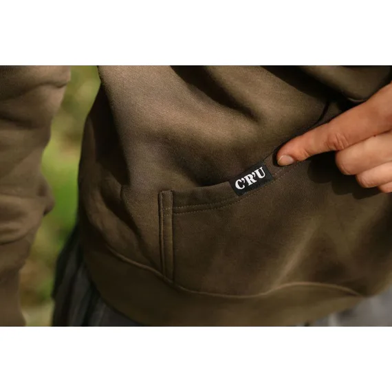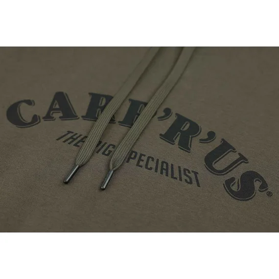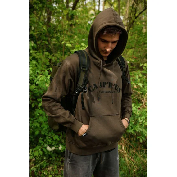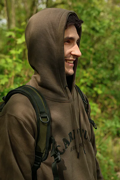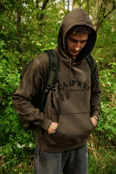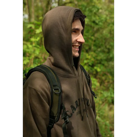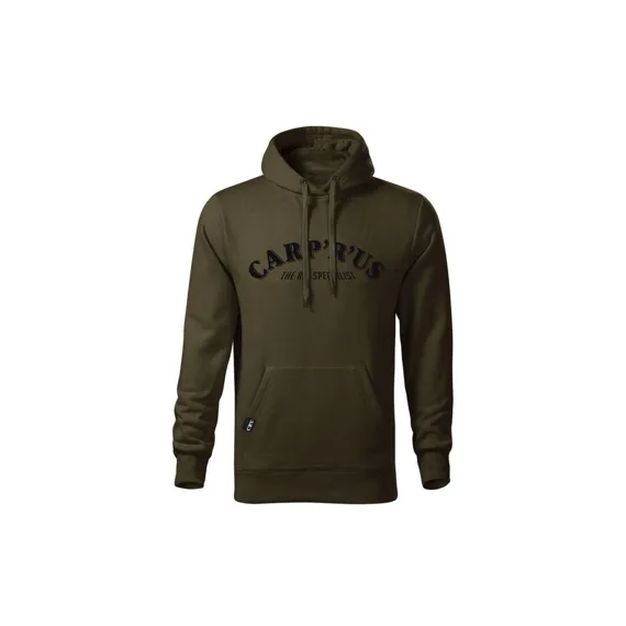 Stylová mikina v hnědozelené barvě s kapucí, prostornou přední kapsou a velkým logem Carp´R´Us na hrudi.