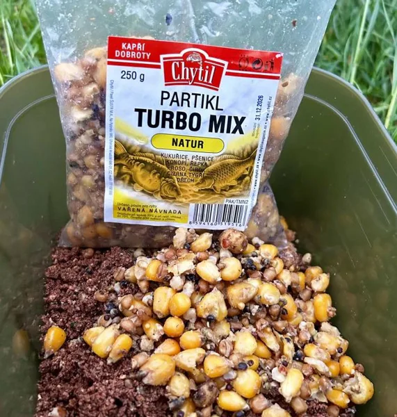 Chytil Partikl Turbo Mix je prémiový vařený partiklový mix českého výrobce, který obsahuje 8 druhů zrn – kukuřici, pšenici, konopí, řepku, proso, čirok, cizrnu a tygří ořech a je vhodný pro celoroční použití. Díky vysokému podílu hrubých a výživných zrn je ideální volbou pro cílený lov velkých kaprů, ať už jako samostatné krmení, nebo jako výrazné obohacení krmné kampaně. Směs lze dále zatraktivnit například boosterem, obsahuje šetrný konzervant pro zachování kvality a po otevření je nutné ji spotřebovat do 10 dnů; balení má hmotnost 250 g, což zajišťuje praktické použití přímo u vody.