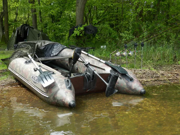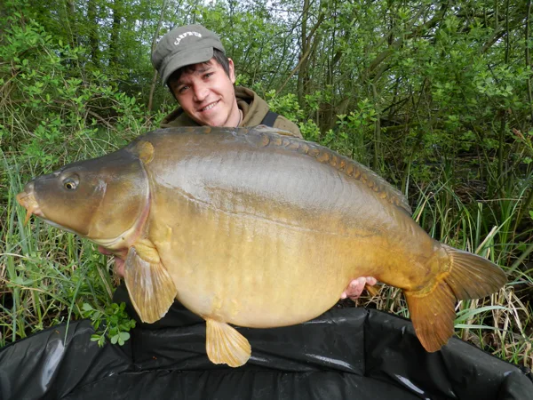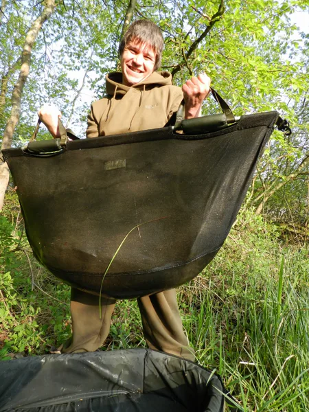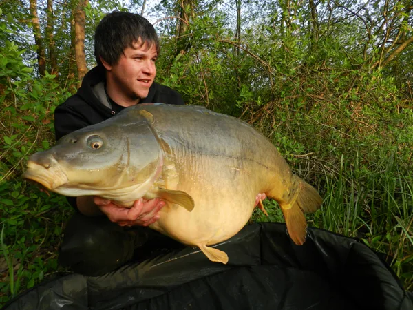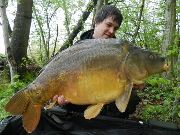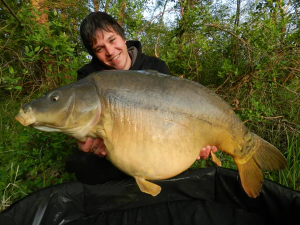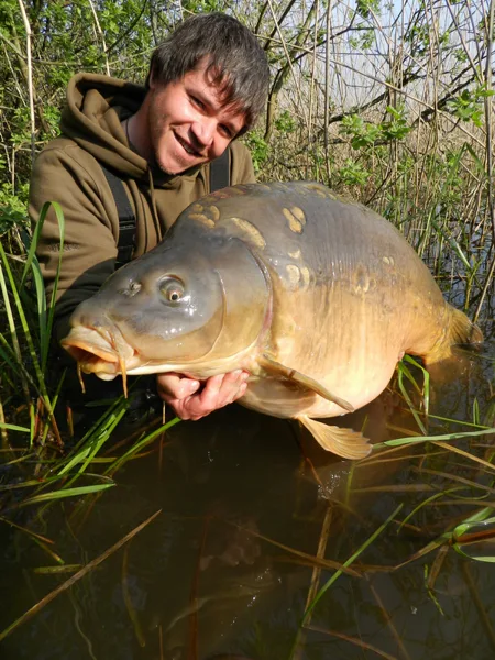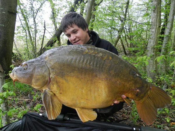 V odpoledních hodinách na něj dostávám prudký záběr. První tah svědčí o slušné rybě. Sedám do člunu a jedu při něj. Mám problémy ho kvůli silnému větru navést do podběráku. Kapr se houpe na vlnách a nejde s tím nic dělat. Musím ho člunem objet a nasměrovat si ho po směru větru. JE MŮJ!!!