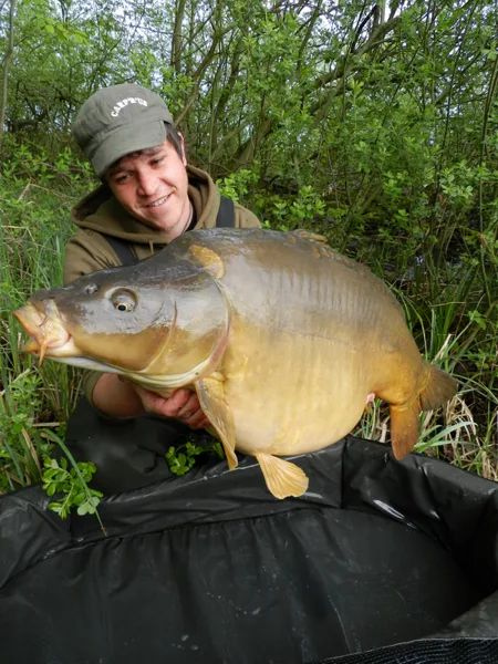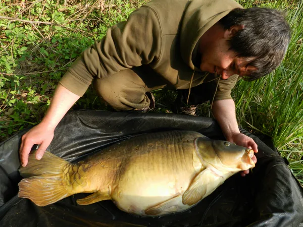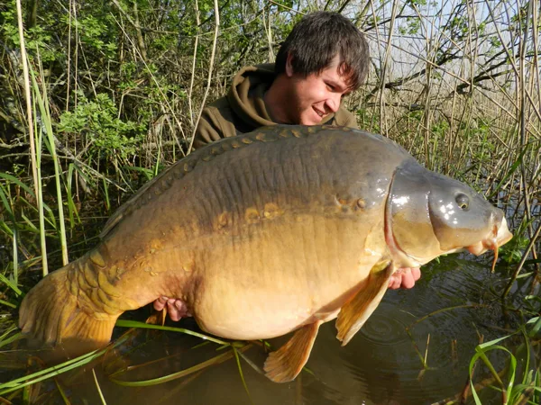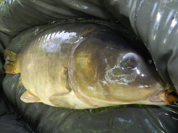 Obrovský lysec s váhou 23kg mě pěkně potrápil. Sebral 18mm fluoro pop up v esenci banán. Kapra pouštím a užívám chvilky vítězství...