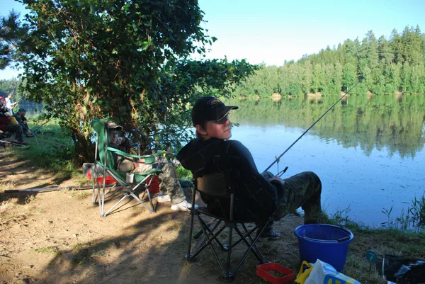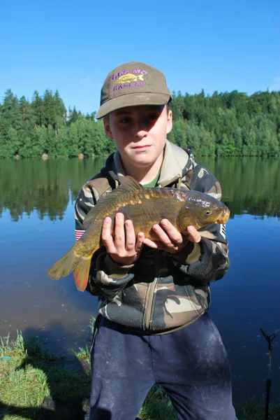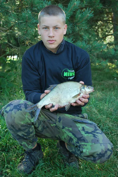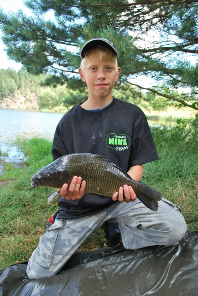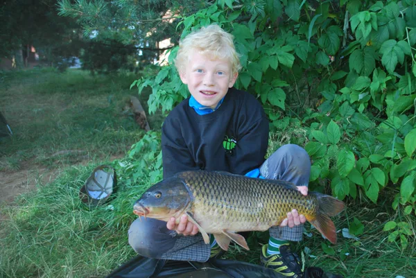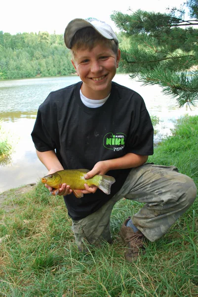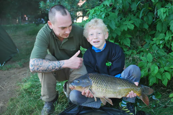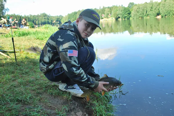 V brzkých ranních hodinách začal program pro děti a to konkrétně rybářské závody. Zrovna ve chvíli kdy jeden z dětských závodníků, začínající sympatický kaprař s přezdívkou Anděl, stahoval svůj prut, kterým přehodil můj pravý, vyvezený 300metrů napříč přehradou, přišel záběr a to zrovna na ten přehozený prut! Po úspěšném zdolávání jsem na něj vytáhl jediného většího kapříka, tmavého původního šupináče okolo 65cm. Proto jsem sním nechal před objektivem fotoaparátu zapózovat samotné Andílka…