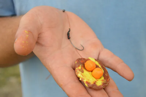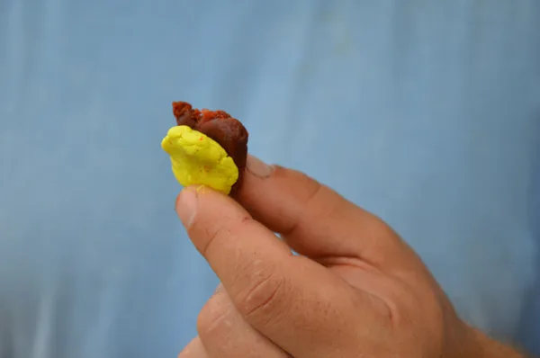 Kúštik som si uštipol z ready pasty Krill Berry a následne rovnaké množstvo s Ananásovej Fluoro Pop-up pasty. Tieto dve pasty som spojil a zhotovil som jedno dovojfarebné homogénne cesto. Takto zaujímavo sfarbenou pastou som obalil nástrahu vysiacu pod háčikom, ktorá následne putovala do vody.