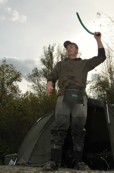 Metrový sumec nám radost příliš nedělá. Další záběr ze zátoky už má ale na svědomí 15kg kapr, kterého krátce nato následoval stejně velký špígl. Rázem bylo vše veselejší. Ráno s příchodem deště se začínají točit ryby na našem hlavním krmeném místě. Po pár minutách mám akci na svém prutu a po tvrdém boji ze břehu do podběráku navádím prvního kapra. Netrvá dlouho a následují ho další ryby. Střídavě se ozývají záběry skoro na všech prutech a my zdoláváme jednoho fantastického kapra za druhým.