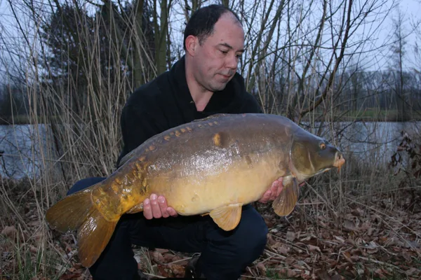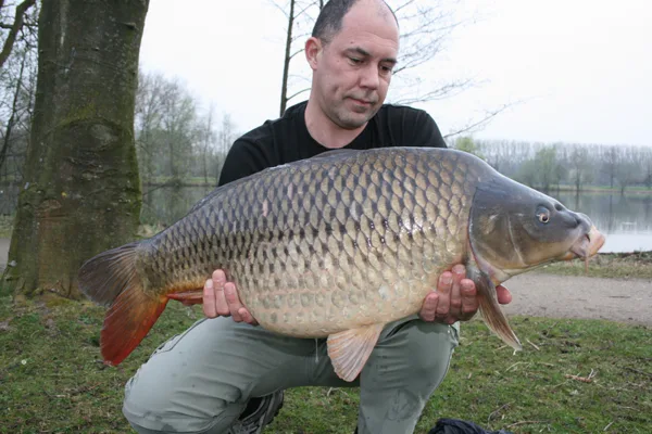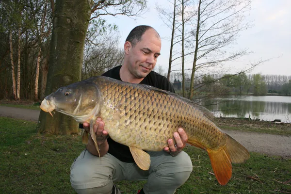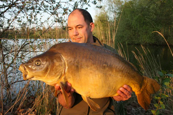 Poté jsem se dál pár dni pauzu, zakrmil na druhou lístku u kanálku k prvním. Je po ochlazeni a mýslim že ryby z mělký první odtáhlí do druhého lístku. Na krmní místo nahodim a dokobruju pár kouliček, druhý prut vyvažim lodičkou až k golfového hrístě na mělčinu v závětří. Tentio krát nemusim čekat do tmu, hned v pul sedme mně odjede prut u hřistě. Souboj je pomalu a výtrvalé. Po nějaký dobu se připojuje i pár známých kaprařu. Jdou krmit pro víkendový akce mládeže, ted ale zírají do vody a zkoumaji co to tahám.
