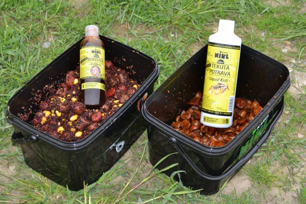 Rychle připravuji směs řepky, trošku kukuřice, berry pelet a rozkrájeného berryho a celé to zalévám boostrem Krillberry. Druhý flíček chci rozkrmit Devill krillem a Kill krillem. Také krájím, aby na strmém břehu, který je pod vodou se vše neskutálelo úplně na dno. Celé to ještě zaliji tekutou potravou Liquid krill, abych kapry rychle nalákal. Přece už mám jen den a půl před sebou. Jdu to obejít a naházet kaprům do kuchyně to, co mají rádi:)