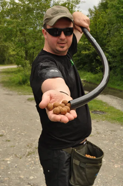 Co se týče krmení jsme měli jasno. Číslo jedna byl osvědčený boilies Kill Krill a číslem dva testovaná novinka na rok 2015 pod krycím názvem Angry Plum. První zákrm byl větší cca 20kg Kill Krill a 5 kg testovaného boiliesu. K vnadění boiliesu nám velice pomohla připravovaná uhlíková kobra od CARP´R´US. Pomocí ní se dá vnadit do větší vzdálenosti, než jste schopni vůbec nahodit. Kobra je neuvěřitelně lehká a necítíte únavu ani bolest ruky při větším zákrmu.