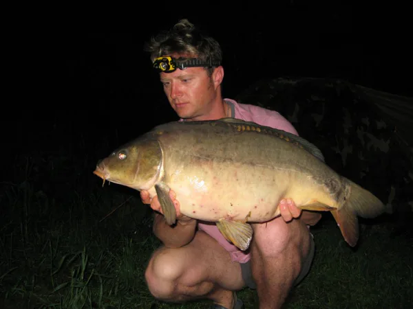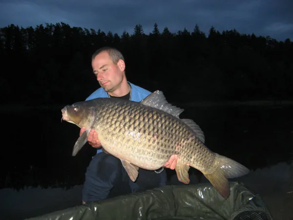 Přes den nám brali menší kapříci. Na večer jsme opět vyměnily boilies za nové a po hodině po zavezení přichází opět padák na Hotové boilie KrillBerry .Hned po záseku si ryba bere nekompromisně metry,proto neváháme a nasedáme ihned do člunu a jedeme za rybou.Po hodině souboje se rybu nedaří odlepit odedna a adrenalin je na maximu.Po neskutečně dlouhém souboji se konečně ukazuje šokovka do které je zamotaná bojka a chuchvalec vlasců a šnůr co rybaři zanechali ve vodě.A zde mi přichází na pomoc můj parťák,protože přes chuchvalec vlasce nelze dál navijet vlasec na cívku.Tak bere do ruky šokovku a pomalu přitahuje rybu k hladině.Zbývají poslední dva metry šokovky a mi ani nedýcháme a v tu chvíli se nám ukázal u hladiny šupík odhadem 20+,až na potřetí se nám kapra daří podebrat a mi si můžem vítězně zakřičet.Hned šupíka vážíme a váha se zastavuje na neskutečných 22kg,je to můj nový osobáček.