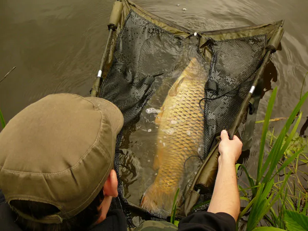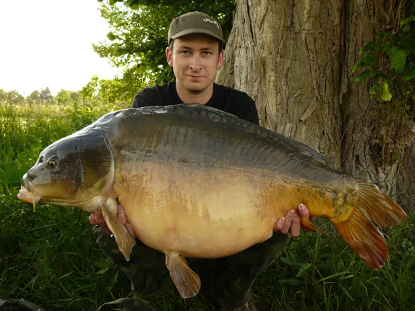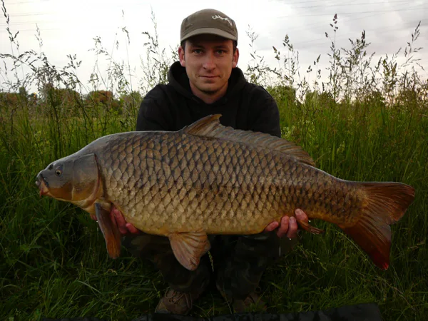 Snažím se ho otočit, a když se mi to konečně povede, nevím, jestli zdolávám já kapra, nebo kapr mě. Zdolávám něco hodně těžkého, co je přilepené u dna a občas škubne hlavou. Nic rychlého ani divokého. Zdolávám ho z daleka a tak je každý navinutý metr vlasce v navijáku velmi napínavý. Když ,,to´´ mám někde před sebou, začínám se to zvednout k hadině, ale jakmile mezi přitahováním udělám pauzu, abych navinul vlasec, kapr toho využívá, otočí hlavou a rozjede se opačným směrem. Vše se několikrát opakuje. Když už je to ale po několikáté, ukazují se na hladině víry a pochvíli i bubliny. Tady už je zcela jasné, že nejde o žádného bojovného juniora, ale o zkušeného seniora, který ví, co dělá. Poprvé se ukazuje na hladině. Je to lysec jako hovado! Obrovská hlava s ještě větším tělem. Do podběráku ho vůbec nebylo jednoduché dostat a několik výpadů ještě podnikl, ale jakmile si loknul, chtěl jsem ho napoprvé dostat do podběráku. Povedlo se! Mám v podběráku něco moc velikého, širokého a těžkého. Obě ruce mají při vyndavání z vody co dělat. Na podložce se mi neukazuje veliký lysec, ale obří koule. Je to naprosto úžasná ryba a začíná mi vše docházet. Nedočkavostí začínám měřit a vážit. Délka se zastavuje na dlouhých 95cm a ručička váhy ukazuje 19,5kg!!! Wow, paráááda!