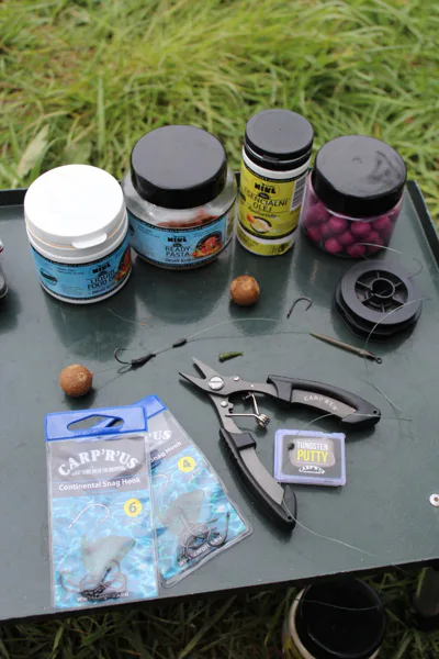 Co se týče koncových sestav,ty již několik let sestavuji z produkce firmy Carp r us a nemám důvod měnit. Mezi mé oblíbené háčka patří háček Continental, doplněný o mouthsnaggera. Co se týče návazcového materiálu, se vší spokojeností používám potahovanou šňůrku Strip-X.
