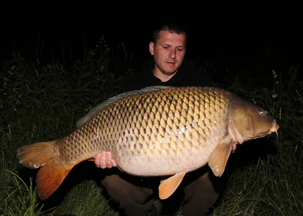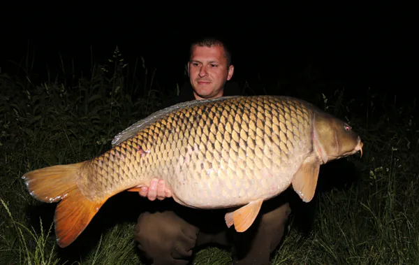Nyní zbývalo už jen dopravit přibližně 10kg krmení na lovné místo a poté do stejné vzdálenosti dopravit i obě montáže. Jak jednoduché Usmívající se Po dvou hodinách krmení jsem toho měl opravdu dos a doufal, že ke mně budou alespoň kapři milosrdní v podobě společné fotografie s některým z nich. Nastal první podvečer a já konečně měl i oba pruty v místech, kam si kapři jezdili pro předložené dobroty.  Těšil jsem se na brzkou první pořádnou jízdu a některého z masivních kaprů na podložce. Bohužel není vždy vše tak jednoduché a já si musel na ten správný záběr ještě chvíli počkat. První záběr přišel až druhý večer a to na „švestkového panáčka“. Byl to malý lysec okolo 60cm, kterého jsem hned ve vodě odháčkoval. Sliboval jsem si, že kapři konečně mé rozkrmené místo našli. Zbytek noci a další den se na mém místě nic nedělo. Blížil se další, pro mě poslední večer a já se již pomalu smiřoval s tím, že tentokrát pojedu domů s prázdnou a připíšu si zde další neúspěch. Čas povolené doby lovu se neúprosně krátil a já z lehátka doslova hypnotizoval své pruty. Bylo něco málo po 23hod, když se rozsvítila modrá dioda signalizátoru na prutu, kde byl nastražený Kill Krill. Než jsem se dostal k prutu, brzda navijáku už pěkně procvakávala. Zvedl jsem prut a po 15min boji, během kterého mi kapr stačil zajet do vázky a zase z ní vyjet, jsem navedl do podběráku předpisově stavěného šupináče, kterým jsem překonal osobní maximum na téhle vodě. Ale hlavně - na poslední chvíli jsem prolomil hranici mezi úspěchem a neúspěchem ve svůj prospěch.