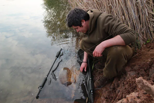 Venkovní teploty se pohybovaly nad 20st a většina ryb byla těsně pod hladinou. Několikrát jsem se vypravil k vodě vyhřívající se kapry pouze pozorovat. Břehy byly plné cejnů, kteří se připravovaly na tření. A o tom moc dobře vědí i kapři, kteří nejsou daleko. Rozhodl jsem se lovit kousek od břehu. Ke každému prutu jsem lopatkou přihodil 1kg testovacího boilie  Gigantika a jako nástrahu jsem použil 24mm boilie téhož druhu + 14mm pop up bílé barvy. Návazec z 25lb ztužené šňůrky Strip-X, zakončené háčkem Continental 6 + mouthsnaggerem.