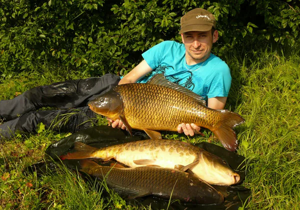 Najednou jsou na břehu dva kapraři, kteří zdolávají kapry v jeden okamžik. Mě se daří šupíka zdolat o něco dříve, proto zjišťuji velikost (74cm) a jdu podebrat kapra tátovi. Tomu se povedl výstavní kousek! Nešlo sice o žádnou trofejní rybu, byl to ,,pouze´´ šupík o délce 76cm, ale jeho obrovské šupiny dělaly tuto rybu hodně zajímavou a krásnou. Prohlížíme si kapříky na podložce a chystám vše potřebné na společné foto. Sahám pro foťák, když v tom se rozjíždí můj druhý prut. Neuvěřitelné! 3 záběry během 10ti minut. Na podložku přikládám třetího kapříka, o délce 64cm, a jen kroutím hlavou se slovy: To nevymyslíš. Pořídili jsme společné foto na památku, kapříky vrátili zpět do vody a užili si zbytek lovu….
