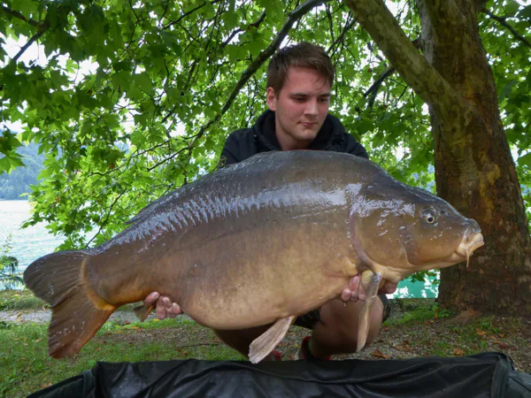 Následující ráno jsem kolem třetí hodiny ranní vyrazil k vodě. Po zhruba 2,5 km cestě jsem celý propocený dorazil na místo. Díky markru jsem si rychle udělal představu o hloubkách a struktuře dna. Montáže jsem se snažil nahazovat zhruba na místa, kde jsem předešlý den viděl nejvíce ryb. Jednalo se o tvrdá místa s hloubkou kolem 15 m. Jako návnadu jsem zvolil již lety prověřený Kill Krill, který jsem ještě přelil pořádnou dávkou Krillového liqudu. Pod háček jsem nastražoval jak jednu 24 mm nadipovanou kuličku, tak i panáčka stejné příchutě. Každou montáž jsem ještě obohacoval o voňavou punčošku se Stick mixem Krill and Fish. Během dne se nic moc nedělo. S nástupem večera se však situace změnila a jezero rázem ožilo. Zanedlouho přišla i první jízda. Hned po zvednutí prutu mi bylo jasné, že by se mohlo jednat o slušnou rybu. Po chvíli se mi podařilo podebrat prvního krásného 19 kg šupináče. Vše jsem sbalil a celý promáčený, ale zároveň šťastný, jsem vyrazil zpět na apartmán. Následující dny se situace opakovala. Ryby na místo najížděli opět ve večerních hodinách a mě se tak podařilo pochytat několik krásných ryb v čele s téměř 20 kg lyscem s obrovským kormidlem.
