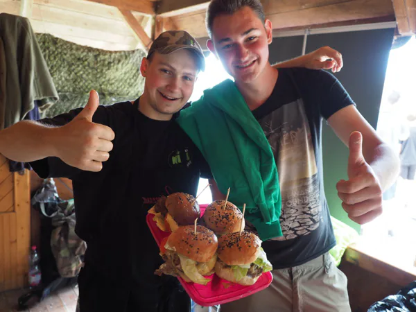 Dopoludnie plné akcie striedal luxusný, neskorší obed v podobe hamburgerov, ktoré pre nás pripravil Lukáš Havlíček. Takú lahôdku sme pri vode ešte nejedli. Jedlo hodné malých bohov nám dodalo potrebnú energiu a chlapcom ešte väčšiu chuť chytiť poriadnu rybu. Začali sa diať divy.