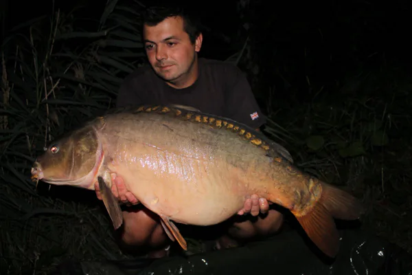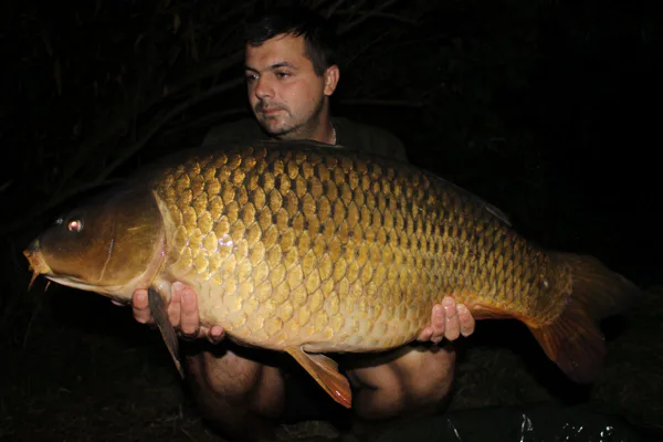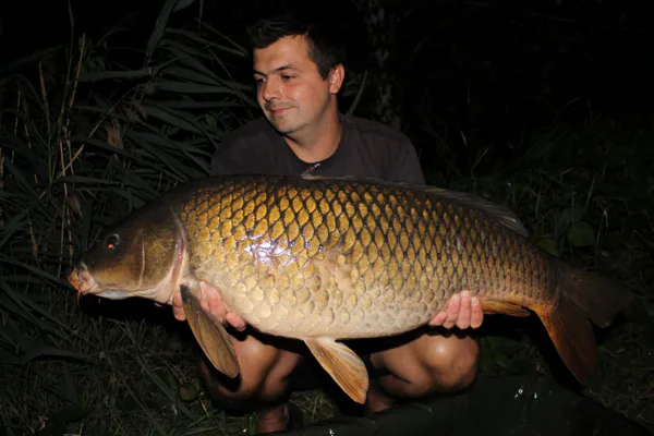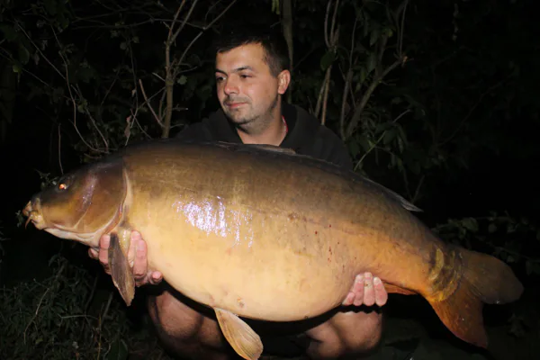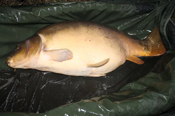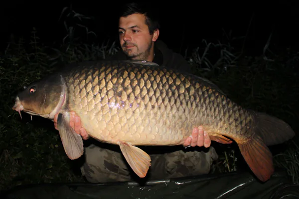 Záběr za záběrem a jako poslední rybu zdolávám vysokého šupináče s váhou 16,5kg. Už chci jít zabalit druhý prut a najednou to pípne a swinger spadne dolů. Tak si myslím, že táhnu cejna a když posvítím čelovkou do vody, tak vykulím oči a nechápu to. Když si na podložce prohlížím velkého lysce, tak hned poznávám, že je to starej známej lysec, kterého jsem chytil před 2 roky, akorát je o 3kg težší.Je to pro mě nový osobáček v lyscích. Opět úplněk nezklamal.
