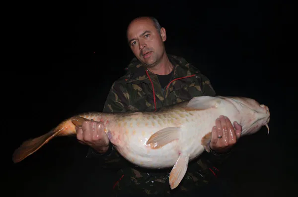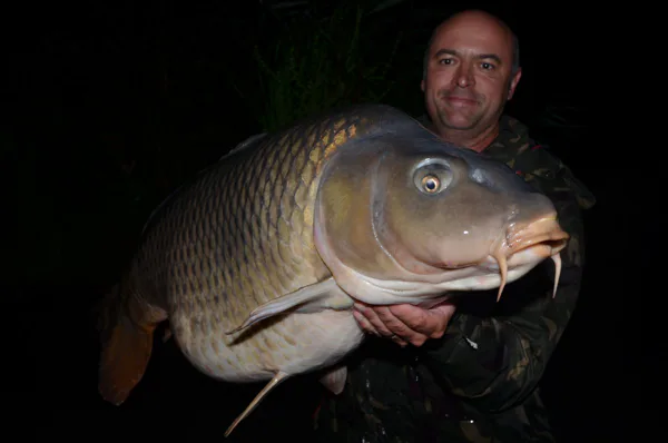 První den po menším rozkrmení boilies - Kill Krill a KrillBerry mi zabral k večeru kapr 10, 2 kg, vzal si kuličku 21 mm boilie Kill Krill obalené v těstě. Pak přišlo ochlazení a prudký pokles tlaku. A já byl celých 24 hod. bez kontaktu s rybou. Nepomohl ani přechod na menší atraktivnější nástrahy Carpbonbons. Stále jsem věřil, že mi ryby na lovné místo najedou a toho dosahuji při pravidelném zakrmování každé 3 hodiny. K tomu bylo použito předmočené boilie Kill Krill + Berry ( na tyto dva zabijáky se mohu vždy spolehnout ). Staré jezero mám velice dobře přečtené. Proto jeden prut tlačím do vzdálenosti kolem 120 metrů ( náhozy z vody ) za krmné místo na menší vyvýšeninu. Třetí den dostávám na tento prut při stmívání záběr, který šel do hodně pomalé jízdy, píp- cvak, píp- cvak, píp- cvak. Od prvního zvednutí prutu mi bylo jasné, že to bude nejtěžší ryba, kterou mám ve svém životě na prutě. Zdolání tohoto kapra trvalo 20 - 30 min. Když už jsem ho měl u břehu po krásném souboji a zahlédl jsem ho při světle čelovky, na nic nečekám a jdu mu do vody s podběrákem naproti. Centimetr po centimetru ho přitahuji do podběráku, dvakrát se mi nad ním otočil a zamával mi ploutví. Stál jsem po pás zmrzlí ve vodě, pak se mi to povedlo, a já ho podebral. ,, Je to Gigant " !! V tlamce měl veliký stisk jak drtí škeble, nemohl jsem mu vyndat ani háček. Byl to nepopsatelný zážitek. Od rybářů z vedlejšího místa, kteří mě s ním i profesionálně ve vodě nafotili se dozvídám, že se jedná o kapra jménem " Tiskař " . Každý touží se s ním setkat. Jeho aktuální váha byla 27 kg ( po odečtení saku ).