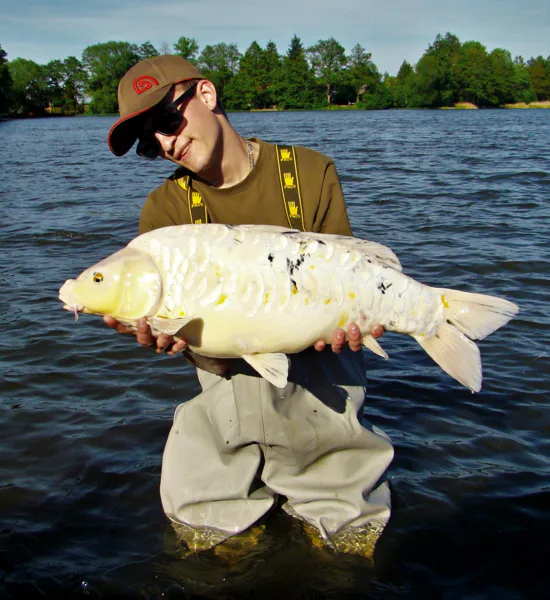 Malú chvíľku som debatoval z Vítkom, ktorý ma privítal priamo na hlavnom móle u Jakuba v záhrade. Odolať rybárskemu pudu však bolo takmer nemožné. Musel som stoj čo stoj nahodiť. Do rozvlnených vôd. priamo na hranu plytčiny a hĺbky leteli dva Multi-rigy zhotovené z Continentalu ATS č.6, mouthsnaggru a mikroobratlíku. V esencii dipované popky Gigantiky a Extázy mi prišli pod ruku. Neváhal som... Trefa! Netrvalo to ani desať minút a prvá ryba bola na svete. Nádherný biely KOI s obrovskými šupinami. Jeho bojovnosť prevyšovala rozmery a tak ma pred podobratím hodnú chvíľku potrápil. Onedlho nasledoval ďalší záber. Uff... tie brutálne jazdy ma nikdy neomrzia. Tento raz však išlo o statného šupíka. Vďaka prirodzenej potrave boli ryby v úžasnej kondícií o čom svedčil nie len ich vzhľad ale i bojovnosť.