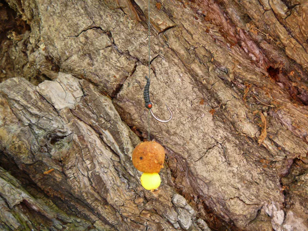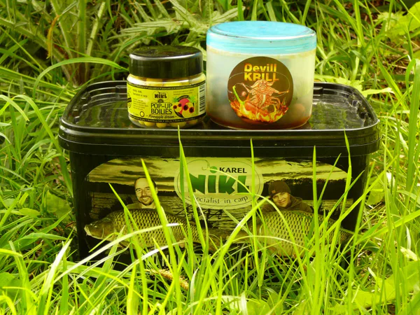 Toto dokonale nasáklé boilie jsem v den výpravy hned v brzkých ranních hodinách nakobroval do vody a na krmné místo jsem poslal jednu montáž s 18mm boilie Scopex-squid a na druhý prut jsem zvolil prezentaci 18mm Scopex-squid s 10mm pop-up boilie Pineaple dream. Tady už byl výrobcem mé prezentované nástrahy samotný kolínský šéfkuchař a vítěz WCC 2016 Karel Nikl. Celé dopoledne, které bylo zatažené a doprovázené větrem, jsem pozoroval kapří aktivitu tak maximálně na hladině. Kapři se ukazovali i na mém krmném místě, ale záběr se ne a ne dostavit, proto jsem po obědě změnil taktiku a pod jeden háček Centurion 2000 ATS vel. 6 doplněného o rovnátko Mouthsnagger Shorty black jsem nastražil boilie Devill Krill 18mm s 10mm pop-up boilie Pineaple dream. Toto boilie bylo dlouho dopředu zatraktivněné boosterem KN s příchutí Devill Krill.