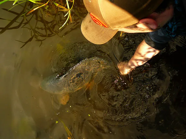 Jednou takhle odpoledne po práci jsem měl volnou chvilku a tak jsem ji využil tím, že jsem sednul na kolo a jel se projet kolem vody, udělat takový průzkum, jak to kde vypadá nebo alespoň co se kde děje. Doufal jsem, že uvidím nějaký pohyb na jednom ze třech vytipovaných míst. Svatý Petr mi dal znamení hned na prvním místě v podobě šplouchnutí v leknínech. Na toto místo jsem se zaměřil a v polarizačních brýlích mu věnoval svou pozornost. Po chvíli klidu jsem zaregistroval tmavý stín, který se pomalu začal přibližovat k hladině. Byl to velmi pomalý a opatrný pohyb od tmavého šupináče, kterého když jsem poprvé viděl, hned jsem věděl, že ho chci ulovit.