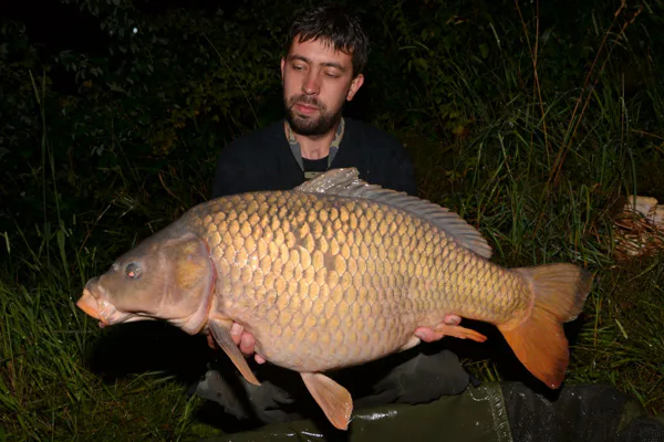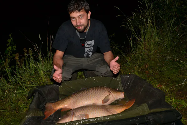 Další dvě hodiny byl klid. Kolem jedenácté hodiny se opakovalo to samé. Při podebírání kapra se mi rozjel druhý prut. Neskutečné! To už jsem během zdolávání volal kamarádovi z vedlejší vesnice, jestli nespí a nechce se stavit na pokec. Během chvíle byl na místě a vyfotil mě s dnešním druhým doublem.