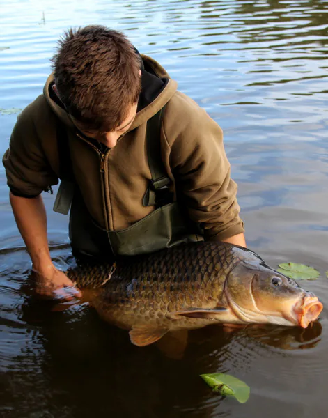 Z pohodlí nového spacáku a postele mě dostala celkem solidní jízda na spodní prut, rybu sem po několika desítkách metrů vlasce vymotaného z cívky otočil a pomalu ještě s několika výpady jsem ji zdolal. Následně jsem zjistil že odnést rybu na podložku bude chtít krapet víc síly, až na podložce jsem pořádně viděl co se mi to povedlo za parádní kapřisko, brutálně stavěná jikra. Co víc si od nového místa přát…