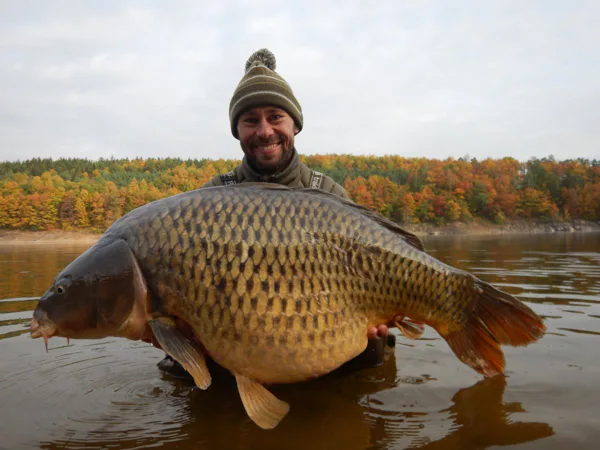 Za šest dní voda vystoupala o 1,8 metru na sloupci. Není to zrovna nejlepší, ale pořád lepší, než kdyby klesala. Výprava se uskutečnila opět v době úplňku, který na Orlíku funguje výborně. Voda měla 16 stupňů. Jako nástrahu jsem použil Giganticu, která prostě chytá velké ryby. Chytám převážně z bahna, tak koule předmáčím a následně boostruju. Pod háček dávám silně předipované boilies, klidně dva měsíce. Za pět dní jsem chytil pár krásných kaprů. Největší měli 14,3 15,3 a 16 kilogramů. Je poslední den ráno a já už jsem byl spokojený a těšil se zase na chvíli domů. Píp, píp... Dvakrát to píplo a swingr se lehce přilepil k prutu. Špička se chvěla, ale žádná jízda. Asi cejn, pomyslel jsem si. Prut jsem chtěl stejně ještě naposledy převést a tak lehce přisekávám. Připadalo mi, že visím, ale najednou se to trošku rozjelo do strany. Okamžitě jsem věděl, že to cejn asi nebude a tak sedám do člunu. Po chvíli jsem už nad rybou a ta mě vozí po vodě.