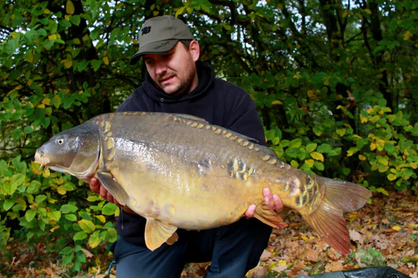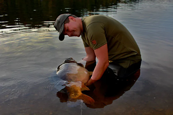 Jak se blížilo odpoledne, byl jsem ve větším a větším očekávání, zda kapři pojedou či nikoli. Jeli a konečně dojeli až ke mně. Od začátku jsem věděl, že mám na prutu konečně kapra, který by mohl pomoct prolomit tu letitou smůlu. O to byla má nervozita větší. Souboj se neuvěřitelně vlekl a každá minuta byla snad pětkrát delší. Pak jsem ho poprvé zahlédl, nebyl obrovský, ale velký byl. Odhad byl jasný, atakuje prokletou hranici. Tlak, který jsem vnitřně cítil, ještě zesílil. Hlavně neudělat chybu. Kapr konečně zmizel v podběráku. Doslova jsem upadl na lavičku a na tváři se mi objevil spokojený usměv, věděl jsem, že jsem to konečně zlomil. Cestou zpět ke břehu jsme se na sebe s Filipem zubili jak malý kluci a přeli se kolik mu navážíme. Přendali jsem kapra z podběráku do vážícího saku a já ani nedutal. Ručička na mincíři lítala sem a tam, až se konečně zastavila a ukázala