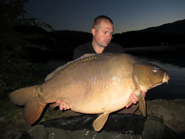 Při focení slyším neskutečnou jízdu, a je to jako z filmu zhruba 22:30, poslední den lovu a poslední půl hodinka, neskutečný. Zvednu prut a ryba nekompromisně jede, po delší době kdy ryba odvíjí desítky metrů a já nejsem schopný jí přitáhnout ani o milimetr se mi konečně povedlo kapra otočit, ale tah nepovoluje, říkám si, že by sumec? Nebo big mama, celou dobu jsem věřil, že přijde. Ryba bohužel zajíždí do vázky u břehu, kde jsem pár ryb ztratil. Byl jsem neskutečně naštvaný, ale nakonec kapr sám vyjíždí, fantazie. A opět začíná šílený boj, Z posledních sil držím prut a brzdu mam na krev, protože zpět do vázky ho už pustit nechci. Po dalších cca 10 minutách mi kolega podebral mohutného šupíka, je to on. Moje vysněná ryba. Mohutný a vysoký šupík. Věděl jsem, že mam rybu přes magickou hranici, ale váhu jsem nebyl schopný odhadnout. Při zvedání kapra z vody jsem už věděl, že to bude zajímavý a po tom co ležel v podložce jsem si říkal, že by nový osobák? A fakt jo, famózní šupináč a váze 25,9kg. Tímto jsem pokořil další hranici, a ještě na vysněný rybě. Bylo to jak ve snu a já byl naprosto šťastný. Prostě pecka a mohl jsem naprosto s klidem druhý den odjet naprosto šťastný domu. Všichni nakonec byli spokojený, já s parťákem jsme pochytali krásné ryby a ženský viděli krásy Slovinska a něco popili. Prostě dovolená jak má být a já už vím, že pokuď to půjde na podzim jsem zpět.