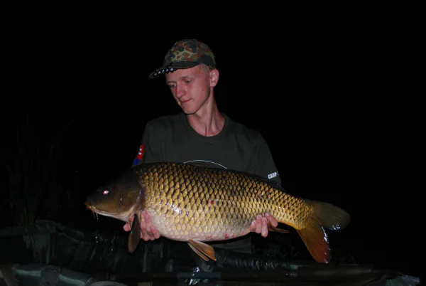 Slnko zašlo, mesiac pomaly vychádzal a spolu s ním sa začínal po lúkach, lesoch a vode ozývať srnčí brechot, ktorý do tejto situácie priniesol neskutočnú atmosféru. V noci ma zobudil pekný šupík, ale jeho váha nepresahovala váhu nášho najmenšieho bodovaného kapra. Poďakoval som mu, dal mu pusu na rozlúčku a s najväčšou opatrnosťou som ho pustil späť do jeho domova. Za svoj skutok som bol odmenený a o štvrtej ráno prichádza ďalší záber. Teraz to bola ryba, ktorá už presahovala váhu nášho najmenšieho bodovaného kapra, takže bolo prvé prepisovanie s 11kg poloriadkačom. Ako každá ryba tak i táto mala niečo do seba. Pri boji to smerovala rovno do prekážok a nechcela mi dať ani meter zadarmo. Od vtedy sme už nemali žiadny záber. Trošku som špekuloval a spravil novú montáž s háčikom Cranked Hook ATS a k tomu rovnátko Mouthsnagger Shorty, do ktorej som vložil všetku svoju nádej. Po niekoľých pípnutiach prišla po štyroch hodinách neskutočná jazda na prút, kde bola táto montáž ,,nádeje,, s dvomi guľkami 3XLka. Asi 10 minútová zdolávačka a je v podložke...