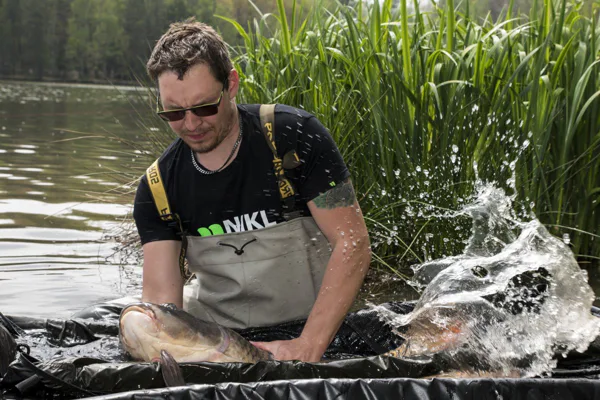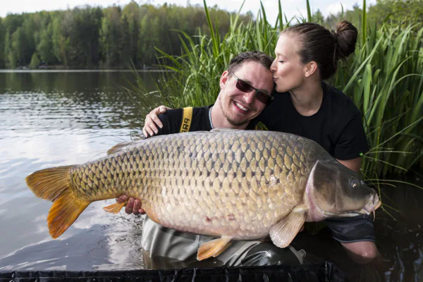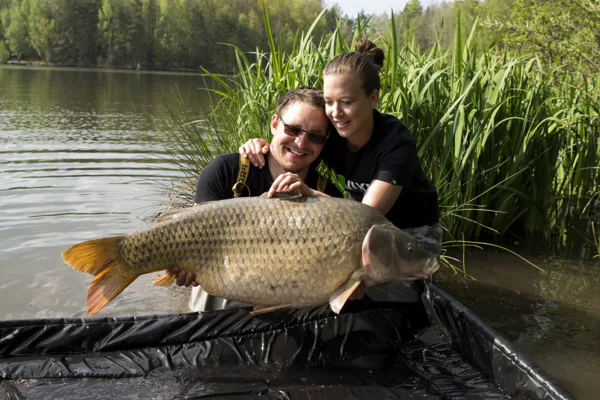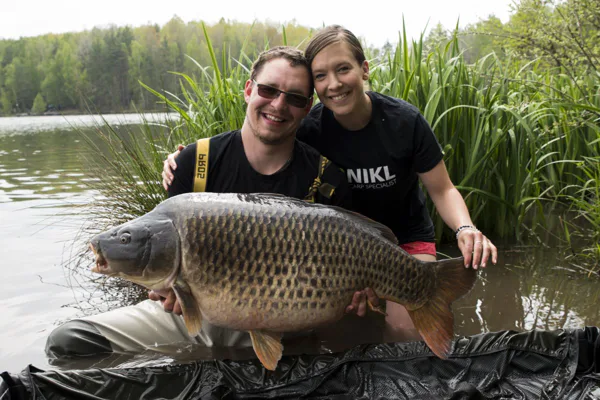 Naštěstí jim to vůbec nevadilo. Podařilo se nám ulovit několik opravdu krásných kaprů a spoustu menších. Avšak jeden okamžik, který se zde udál, se nám vryl do srdcí a už nikdy nezmizí. Krátce asi 2 hodiny po dešti, kdy na nás vykouklo sluníčko, dostávám záběr na jeden prut a s kolegou se vydáváme za zdoláváním. Janča zůstává na břehu a šteluje si foťák, aby nás mohla fotit. Nevím přesně, ale tak do 5 – 10 minut, se rozjíždí můj druhý prut. Janča nechává focení a běží zdolávat další prut. Jen co to vidím, s kaprem si přestávám hrát a na první dobrou ho podebíráme. Uháníme na břeh, abych se postaral o prut druhý. Ale jak jsem později zjistil, můj stres byl zbytečný. Jakmile přibíhám k Janě, už má kapra v podběráku a směje se na něj. Vůbec jsem nevěnoval pozornost, co zdolala, protože jsem věděl, že jsem právě zdolal úlovek, pro který jsem zde přijel.
