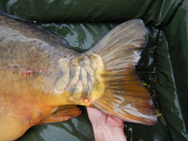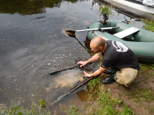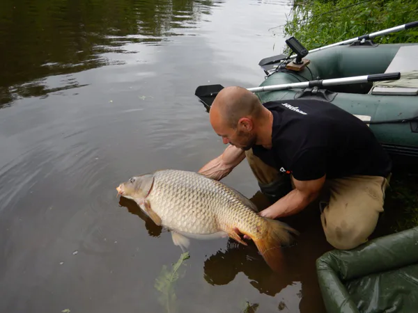 nakládáme do lodi potřebné věci a vyrážíme. Letošní počasí je trošku bláznivé. Nejdříve bylo teplo a vypadalo to na krásné jaro. Pak se bohužel ochladilo a teplota vody spadla zase k 12ti stupňům. Po příjezdu k vodě měla teplota vody slabých 14 stupňů. Ještě se třeli cejni a tohle období je velmi dobré na velké kapry. První dva dny jsme chytli kapry 12,5 a 14,5 kilogramů. Pak se stalo něco, co mi dalo jasný signál se přestěhovat. Strávil jsem pár let pozorováním přehrady a už jsem věděl... U vody se snažím vnímat přírodu a věci kolem sebe. Když jsem řekl Petrovi že balíme a stěhujeme celý tábor o 500 metrů vedle, tak na mě koukal jak na blázna. Vyplatilo se to a třetí a čtvrtý den výpravy jsem pochytal spousty krásný kaprů, z toho největší měli 14, 15, 16 a 17 kilogramů. Věděl jsem, že už prostě musí přijít i ten, na kterého čekám. Udělal jsem pro to maximum... Jak už to tak bývá u velkých kaprů ozvalo se jenom 2x píp píp... Kdo by čekal velký souboj, tak se mýlí. Kapr udělal u břehu pár výpadů, ale to bylo vše. Nic neobvyklého. Do poslední chvíle jsem vůbec netušil co mi vjelo do podběráku. Bylo 6 hodin ráno a já měl ještě zalepené oči. Mohutné a dlouhé tělo kapra se skrývalo pořád pod vodou. Vyndávám kaprovi háček z tlamy ještě v podběráku a stále nemám ani tušení.. Sundávám ramena podběráku, roluji síťku a kapra chci nadzvednout z vody do vaničky. Nějak to nejde, tak si myslím že je to někde zaháknuté o dno.