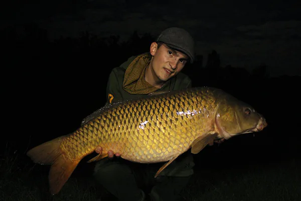 Veľkým benefitom novej rady Ready Ronie Rigs bude i fakt, že budú dodávané už ako hotové náväce na Clearwater Fluorocarbone, ale i ako Naked Ronie Rigs, použiteľné i s mäkkou alebo stuženou šnúrkou. Keďže som chcel vyskúšať obe varianty, nebolo treba dlho vymýšľať. Na jeden prút som tak vyslal Ronie rig naviazaný na približne 25cm dlhom náväzci, z 15lb šnúrky Strip X a druhý prút osadil hotovým 16,5cm Ready Ronie rigom naviazaným na 30lb fluorocarbone. Evidentne som sa kaprom trafil presne do cesty, pretože už niekoľko krátkych minút po nahodení mi pravý prút hlási prvý kontakt na 16,5cm Ready Ronie rig. Krásny, zdravý šupináč mal pekelne ostrý Predator ATS pevne zaseknutý v strede spodnej pery, čím ma utvrdil v tušení, že tieto hotové náväzce budú nesmierne chytľavé. Kŕmenie miestnym kaprom očividne šmakovalo a tesne pri svitaní podoberám starého známeho šupináča, ktorého som mal na podložke už niekoľko krát pred tým.