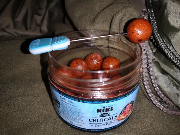 V prvních třech dnech jsem zkoušel ve snaze udělat rychleji záběr na jednom z prutů různé druhy příchutí a průměrů pop-up na montáži/ D – Chod Rig později i Ronnie Rig, ale kapři na ně nereagovali ani jiná ryba. Záběry přicházeli pouze na jedno boilies a to hlavně ve verzi Criticals - 21mm a 24mm silně nasáklé v esencích. Opět mi perfektně šlapala Gigantica a Devill Krill.