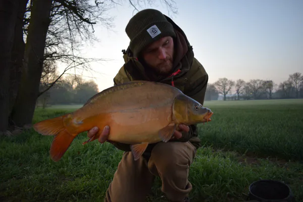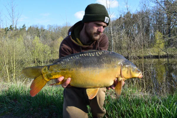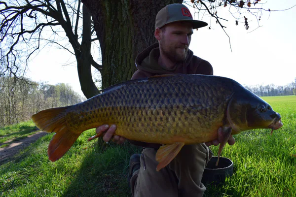 První dva dny byly ve znamení tloušťů a já jsem začínal pomalu zvažovat možný přesun na jiné místo, ale měnit místo se mi také moc nechtělo, protože všude bylo opravdu mnoho lidí a věděl jsem, že by to bylo velmi složité. Řekl jsem si, že následující noc a ráno rozhodne! Noc proběhla opět bez záběru od kapra a já věděl, že pokud ráno nepřijde jízda, tak mě čeká velmi náročný den s hledáním nového místa. To ovšem naštěstí nenastalo a já třetí den výpravy dostávám první jízdu sezóny! Adrenalin se ve mě tak nakupil, že k záběru vybíhám bosý, což pociťuji téměř okamžitě na mých chodidlech, ale ani ten nejšpičatější kámen mě nedokáže v mém počínání zastavit. Jsem u prutu a pevně ho svírám ve svých rukou. Je mi naprosto jasné, že se jedná o statného soupeře a po 20 minutách přetahované podebírám mého prvního kapra. Ten moment dlouho nezapomenu, možná už nikdy do konce života. Stál jsem naprosto zkřehlý, po kolena mokrý, s bolestmi v chodidlech a s klepajícím se celým tělem, možná i trochu zimou, ale více převládajícím adrenalinem a pocitem štěstí. Dobojoval jsem a kapra jsem opatrně přemístil do podložky, aby se mu nic nestalo. První kapr sezóny a hned takové zvíře. Nemohl jsem se na něho vynadívat. Byl jsem v tu chvíli nejšťastnější muž na světě. Kapra jsem nechtěl dlouho trápit a proto pořizuji pár rychlých fotografií a krátké video.