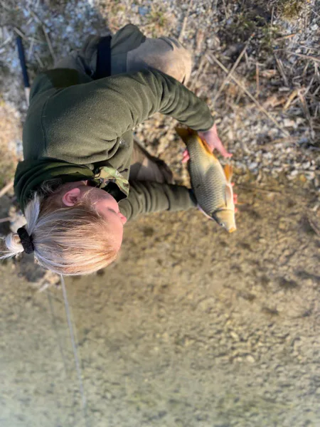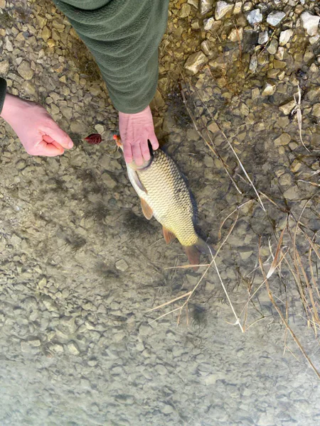 Prvý kontakt prichádza po necelých desiatich minútach. Prvá rybka sa nechala oklamať a hneď kaprík. Malý, ale potešil. Do miery mu pár centimetrov chýba ale na kráse mu to neuberá. Keďže je prvý nasleduje rýchla fotka a šup ho naspäť do vody.