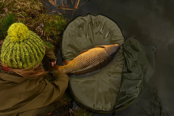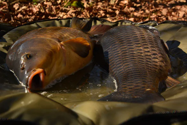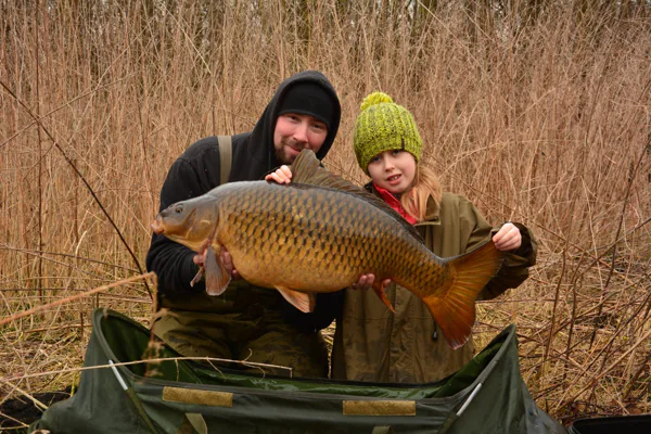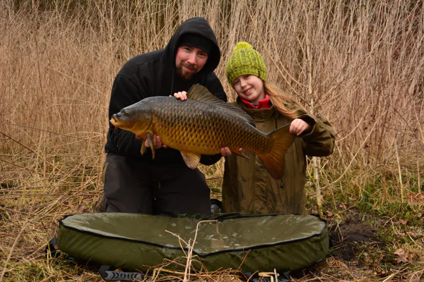Revír má kolem 6ti hektarů a je z 95 % velmi zabahněn. S prutem a olovem, jelikož nemám deeper jsem přijel k vodě a šlo se na věc. Mapování zabralo dobré 3 hodiny a já zjistil, že to nebude nic jednoduchého - Všude řídké bahno. Po zhruba hodině se mi podařilo trefit tvrdé místo s plochou zhruba 50x50cm. Místo se nacházelo 20 metrů nalevo, ale jen 5 metrů od břehu za rákosím u spadeného stromu. Druhé místo jsem ,, vyťukal,, pod větví na druhé straně. Bylo jasné, že zrovna zde se ryby jezdí krmit. Druhé místo jsem našel pod větví na druhé straně. Jelikož preferuji chytání pod nohama, byl jsem s místy spokojen a mohlo začít předkrmování. Vrátili jsem se sem zhruba 6x a vždy jen přihodil 2 hrsti boilie Kill Krill 15 mm a 2 lopatky partiklu. Sice by se na bahnitém revíru měly používat kvůli perfektní prezentaci většinou dlouhé návazce, aby kulička nezapadla hluboko do bahna, já ovšem zvolil taktiku jinou. Jelikož byla vytlučená místa opravdu malá, zvolil jsem opak a navázal zhruba 10 až 12cm krátké návazce (foto č. 1) a to ze šňůrky stripX 25lb a háčků gladiator vel.6. Podmínkou ale bylo precizní přesné nahazování a trefování těchhle malých míst a já věděl, že pokud ,,to ťukne,, tak montáž neleží v bahně ale pěkně na čistém dně. Někdy i na 5x, ale vždy přesné nahazování se později ukázalo jako klíč k úspěchu. Nastal den lovu a já si s sebou přibalil malého pomocníka, dcerku Julinku. Montáže ležely po chvilce na místě. Už jsme nedávali boilí, ale jen lopatku partiklu přímo na montáž. Když se do půl hodiny roztočila cívka navijáku a my společně podebrali krásnou 13kg těžkou tmavou rybu bez jediné chybičky (Foto 2), věděli jsme, že taktika byla správná. Ryba to byla v ten den poslední, ale i tak jsme odjížděli zhruba po 3 hodinách domů nadmíru spokojení a šťastní. Ještě než jsme ale odjeli, opět jsme zakrmili stejnou dávkou jako vždy. Za 2 dny jsme se vrátili zpět na místo a aplikovali stejný postup. Jedna malá 15mm kulička Kill Krill ležela na místě. Do hodinky se cívka roztočila a já podebral dalšího březňáka kolem 10 kg(foto 3). Fantazie. Společné foto a tradáá domů. Poté jsem se sem vydal ještě několikrát, vždy jsem se držel taktiky a podařilo se mi chytit ještě několik pěkných(foto 4), ale už menších ryb. V dubnu jsem už nastupoval do práce, a rozhodl se prochytat těžký úsek naší řeky.
