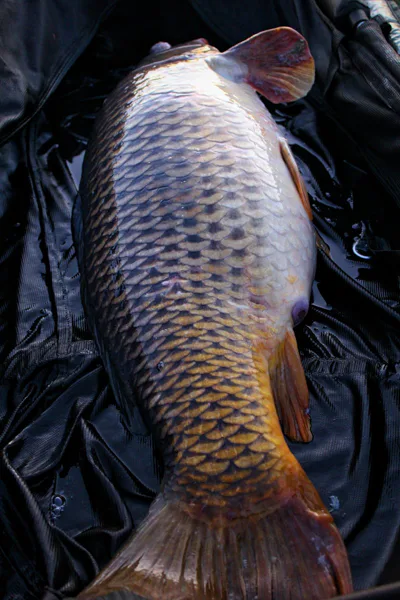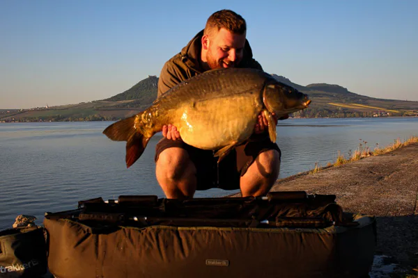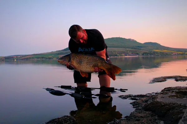 Pruty posílám do vzdálenosti cca 80-90m kde vím že je celkem slušná hrana a kapři za ní jezdí sbírat hlavičky, druhý prut jsem nahodil o trochu dál cca 120m kde už začínají staré pařízky a ke každé montáži přikopíroval cca 1kg boilie. Rovnou jsem si od každého druhu další kilo namočil, pro jistotu že by to bralo, nebo přikrmení na druhý den. Po náročném pracovním dni je to nejlepší oddech, ležíte si v lehátku a koukáte na oblohu když v tom záběr! Bohužel jsem kapra uřízl asi po 10sekundách. Bohužel měním šokovku, dělám nový návazec a vysílám Krill zpět do boje! Ráno jsem se opět dočkal záběru a na bližší prut kde jsem měl panáčka Devill Krillu mě přišla pěkná jízda, což na jezerech většinou znamená pěknou rybu! Na nic nečekám a kapra přímo bagruji ven, tentokrát se mi podařilo kapra navést do podběráku a hned se mi zdá povědomí!