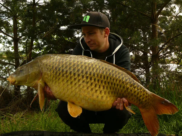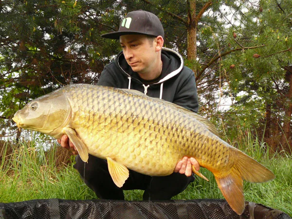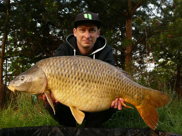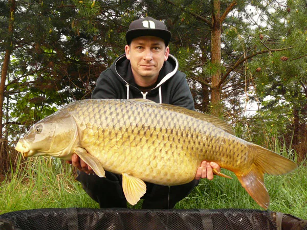 Montáž pokládám do místa s peletami a prut velmi opatrně a hlavně tiše ukládám do stojanu. Povoluji brzdu a sleduji břeh. Kapr se nevylekal a stále se krmí. Opatrně dělám krok dva zpět, abych se schoval se mezi stromy, které jsou hned vedle stojanu. Trochu nevěřícně kroutím hlavou, ale stále pevně věřím tomu, že mou nástrahu vezme. Než jsem stačil celou myšlenku domyslet, prut pod nohama se rozjíždí. Ve vteřině jsem u prutu a zasekávám. Velká ryba na hooodně krátkou vzdálenost. Opravdu vzrušující zážitek. A jeho výsledkem šupináč 15kg!!!