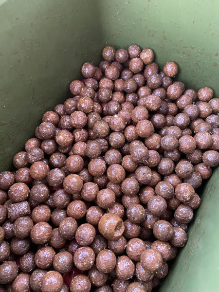 Prvé, čo som rozbalil, boli prúty a teraz mi nastal boj v hlave, ktorú správnu nástrahu vybrať. Nevedel som, čo im tam poslať, kedže na tejto vode nemám žiadnu skúsenosť. Rozhodol som sa vybrať väčší rozmer nástrahy kvôli eliminácií malých rýb, a to bol boilies krillberry 20 mm s malou 12 mm plavačkou tej istej príchute. Vedel som, že táto nástraha sa môže páčiť aj miestnym amurom, ktoré tu plávajú. Na druhý prút som dal jeden 24 mm boilies s príchuťou Salmon&Peach. Ešte vtedy som nevedel, že robím veľkú chybu vo veľkosti nástrah. Háčiky som ozdobil malým PVA, ktorý mi zabezpečil menšiu šancu zamotania montáže pri nahadzovaní. PVA som naplnil silno preboostrovaným methodmixom s príchuťou Kill Krill. Snažil som sa nahodiť čo najďalej od svojho brehu. Montáže mi dopadali asi 70-80 metrov, tak aby som si toto miesto mohol aj nakŕmiť. Pomocou boomerangu som si na lovné miesto nastrieľal asi 50 guličiek z rady Economic feed boilies - prichuť Chili-spice.