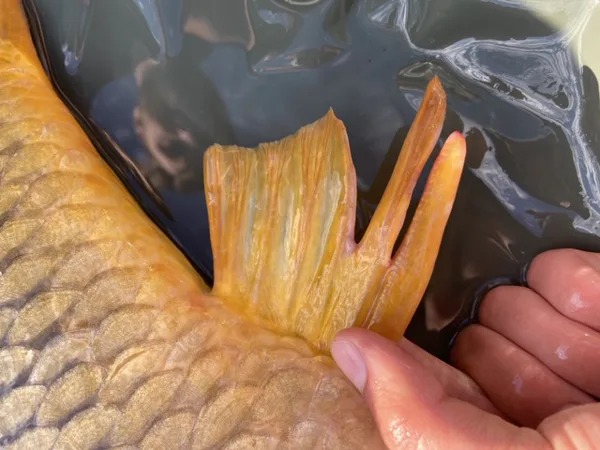 Do ďalšieho rána sa záber nedostavil. Vedel som, že v posledných ostávajúcich hodín musím niečo zmeniť. Montáže som vymenil za kratšie a na systém Carp´R´Us - Ready Ronnie rig som našil malé plávajúce boiliesy s príchuťou Candy Sweet 14 mm. Tento raz bez PVA a s malou zmenou som na olovo pridal Krill Berry pastu. Prikŕmil som a ďalej dúfal na záber, ktorý nenechal na seba dlho čakať. Na breh sa prišiel ukázať malý kapor, ktorý mi urobil veľkú radosť. Po ňom prišli ďalšie a ďalšie. Ak som sa chcel docieliť k niečomu väčšiemu, musel som spraviť ďalšiu zmenu, a tou bola nahodiť udice za kŕmne miesto, kde by sa mohla zdržiavať väčšia a opatrnejšia ryba. Moja predtucha bola pravdivá. Okolo 16:00 mi prišiel konečne iný druh záberu. Opatrný a pomalý, ktorý sa rozbiehal do jazdy. Zdvihol som udicu a cítil som, že toto je ryba, ktorú nesmiem stratiť. Silný ťah a pomalé otáčanie ryby z jednej strany na druhú mi dali najavo, že sa nejedná o niečo malé, no pri brehu som túto rybu stratil. Bol som sklamaný, ale veril som, že to nebola jediná ryba, ktorá sa tam zdržiava. Taktiku som nemenil a švihol som prút naspäť na to isté miesto. Za necelých 15 minút po nahodení mi prišiel ďalší identický záber. Tentokrát som bol pri zdolávaní opatrnejší. Adrenalín mi rozprúdil krv v tele a roztriasol kolena. Obrovskú silu ryby som nevedel na začiatku kontrolovať. Každá jedna ryba sa mi tlačila doľava. Ani táto nebola výnimkou. Veľké šťastie bolo, že rybári, ktorí chytali vedľa mňa sa presne pred záberom tejto ryby rozhodli ukončiť lov a odišli. Ak by sa to tak nestalo, moja ryba, ktorú som nevedel zastaviť, by sa zamotala do ich prútov a hrozila by ďalšia strata. S bratom sme išli za rybou, ktorá sa zastavila o dobrý kus od nášho miesta. Asi po 20 minútach ťažkého a napínavého boja medzi mnou a rybou som napokon vyhral. Ryba úspešne vplávala do sieťky podberáku. Spadol mi veľký kameň zo srdca. Neveril som, že takéhoto kapra vytiahnem z vody. Keďže je tento revír deň čo deň prechytávaný rybármi, ktorí kapra nad 45 centimetrov nepustia v žiadnom prípade naspäť. Stále som neveril vlastným očiam. Upravil som kaprovi plutvy tak, aby som mu ich pred zdvihnutím nad hladinu nezlomil a preniesol som ho na podložku. Tam sa preukázala jeho skutočná krása. Hneď som zbadal, v akom zlom stave má plutvy kvôli iným rybárom. Tenký silon, ale aj zlé zaobchádzanie iných rybárov spôsobili nemalé zranenia na plutvách tejto ryby.