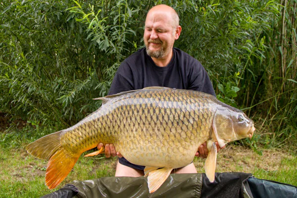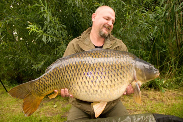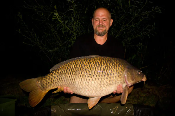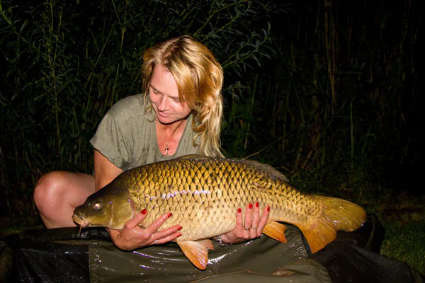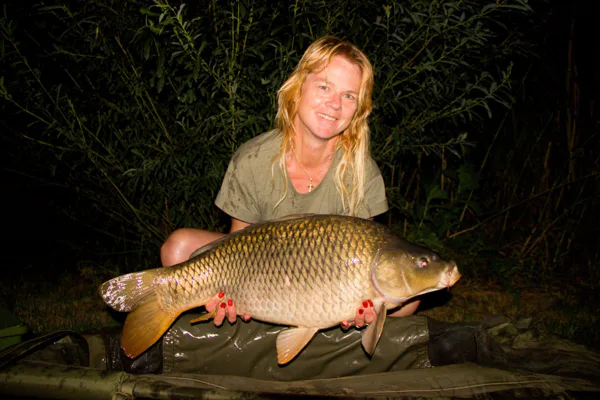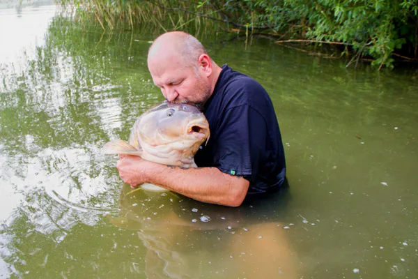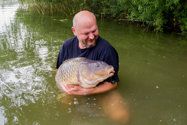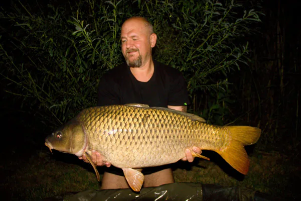 Poslední noc před odjezdem sedím pod deštníkem a přemýšlím co ještě udělat nebo změnit, aby přišel ten správný záběr. V tom jsem si vzpomněl, že přesně tuto situaci jsem zažil na výpravě v Maďarsku a proto neváhám a udělám to tak jako tam. Stahuji jeden prut a „nabíjím“ jednu kuličku 24 mm 68 zakápnutou esencí té samé příchutě a doplňuji PVA síťkou naplněnou minipeletkami ochucené esencí Dead Body. Nahazuji pár metrů od břehu, a protože jsou 4 hodiny ráno jdu do spacáku. Asi po 3 hodinách spánku nás budí příposlech a následuje brutální jízda. Zvedám prut a hned cítím, že je to ta správná ryba, na kterou jsme čekali. Po pár minutách souboje se nám konečně ukazuje mohutné a široké tělo ryby a za nedlouho je bezpečně v podběráku. Máme obrovskou radost. Po odvážení saku se ručička váhy zastavuje na 21,5 KG. Rychle fotíme, trochu pomazlení ve vodě a jde zpět tam, kam patří. To byla poslední a největší ryba naší výpravy a my balíme a odjíždíme domů.