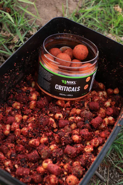Do vody posílám zhruba 3 kila partiklu,s tím, že na jeden prut krmím navíc peletkami DevillKrill o průměru 3mm a 10mm a na druhý prut kuličkami Kill Krill20mm a 24mm.