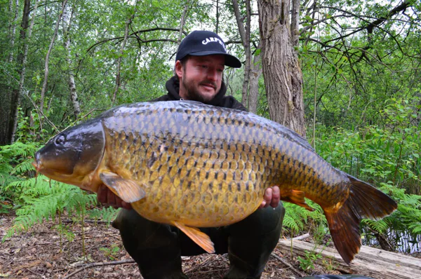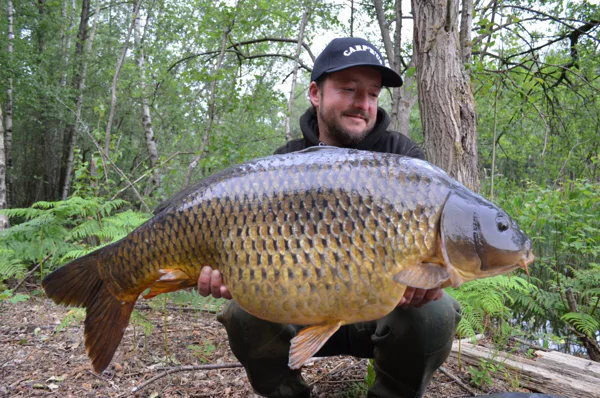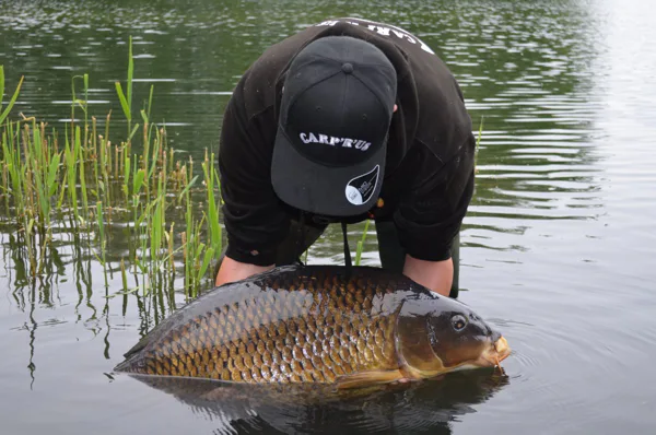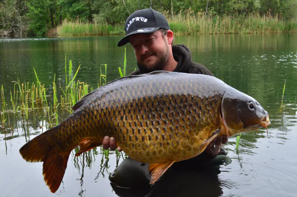 On the first rod i put a combirig made with the stiff link 30lb, a short piece of Smoothbraid 25lb, a size 4 Gladiator LS hook and a brown short Mouthsnagger. On the second rod i put on a Blowbackrig also made out of the Smoothbraid 25lb but then tied on a Centurion2000 hook size 4, a rigring and a long Mouthsnagger. One rod with a snowman of the new bait Volumo and Yellowbird pop-up. The other rod single Yellowbird bottom bait. Now in the boat putting the rods perfectly on the spots, one on the plateau and one in front of the plateau. So now the waiting game begins. The next morning we had not much sleep but not from carp but tench.. So i decided to throw some more bait on the spot and refreshed my rods for the next night. It became dark and Benny his rod was the first to go off. It was his rod on the 300meter spot. After a battle in the boat we can land a nice common of 9kg. So we go back to sleep and at 4 o’clock my rod at the bottom of the plateau went off. It felt a good fish and after 15min Benny could net it.. We look at each other and we where smiling because off the wide of the fish, so a little shout “yes” echoed across the lake. After weighing it was a high thirty who liked the Volumo bolies and couldn’t get rid of the Blowbackrig. We managed to catch some more carp but smaller, but then when the next night falls my rod on the plateau took off again. Only 2 seconds and it stopped, so i jump into the boat. The fish was already swom into the trees, but with the hooks of Carprus i know i can put some pressure on it. The fish was fighting but i could net it safely and put the boat in reverse. Yes i managed to catch another nice common. The rest of the night was quiet but who cares after such a good weekend. Now our session came to an end and with each 4 fish not bad i guess. Also we had some fun and good food.